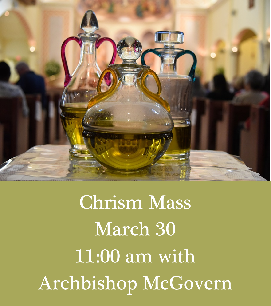 Archbishop McGovern and the priests of the Archdiocese gather at the Cathedral to celebrate the Chrism Mass. This Mass manifests the unity of the priests with their bishop. An important moment of the Chrism Mass is that every priest within the diocese renews his priestly promise. We’re also invited to pray for all priests and their ministry.
