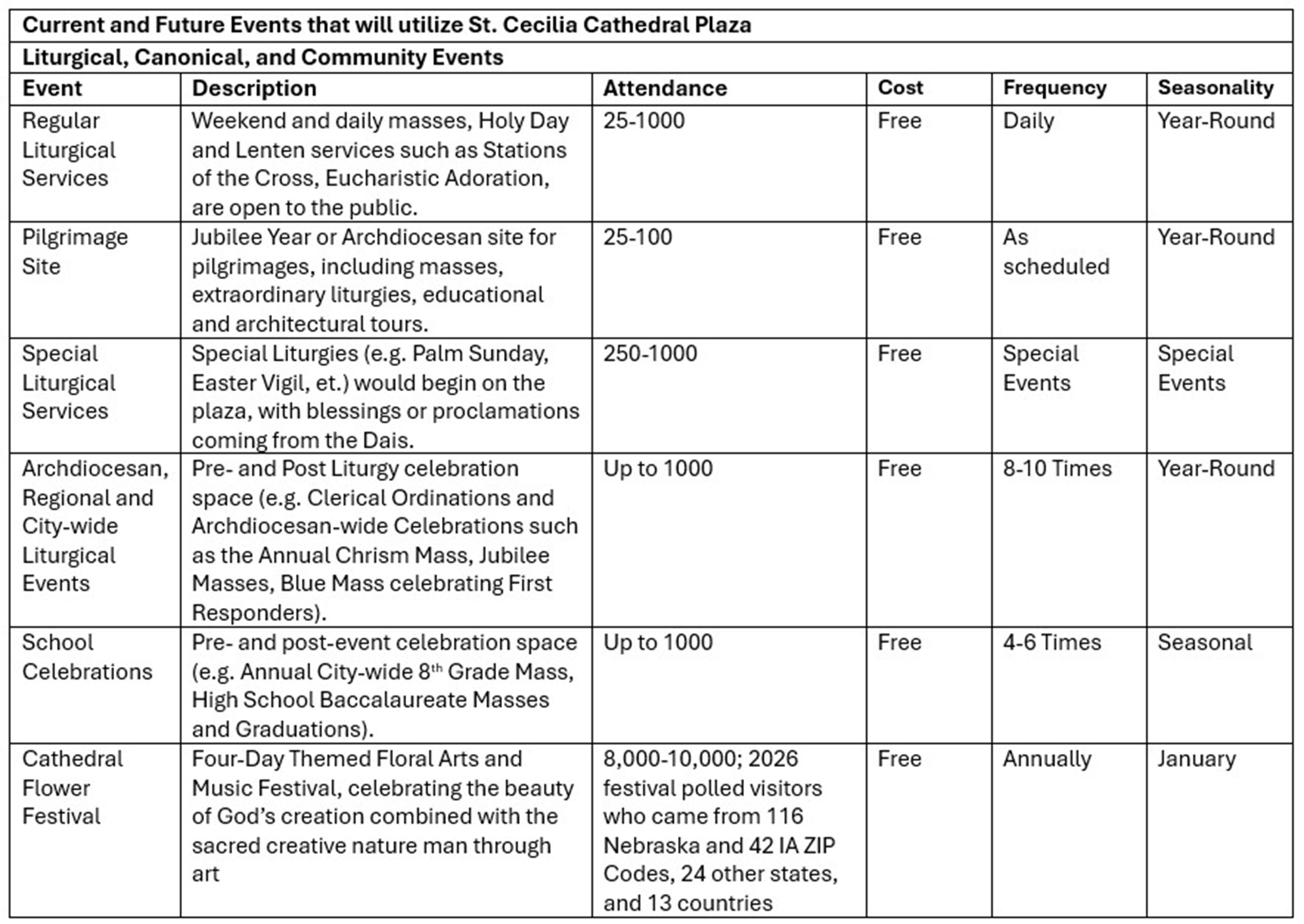 The new Plaza will be used to enhance liturgical services and provide a respectful and appropriate gathering space for Church services, ordinations, graduations, daily Mass, and other liturgical celebrations. The spaces and courtyards will provide increased outreach opportunities to invite the greater Omaha community to join us and can be used for education, worship, and artistic performances. The spaces enhance our hospitality and offer a respectful respite in a busy urban setting.
